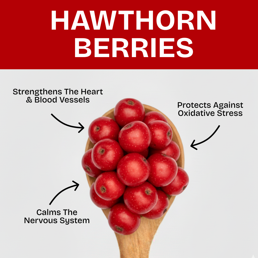 🔥 Hawthorn Berry – Supports healthy blood pressure and strengthens blood vessels.